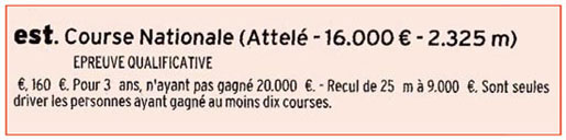Par exemple, les conditions d'une course peuvent préciser Pour chevaux de 4 ans n'ayant pas gagné 50 000 € (voyez un exemple illustré page suivante).